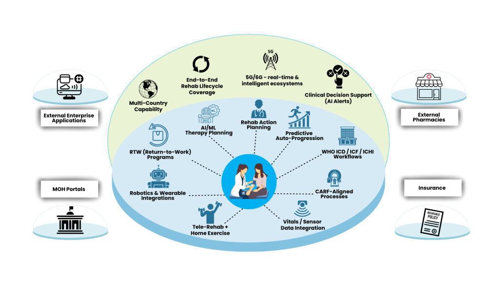 Role-based workbenches for therapists, doctors, case managers, nurses & technicians. Interoperable by design: HL7/FHIR, DICOM, device APIs, mobile & web.